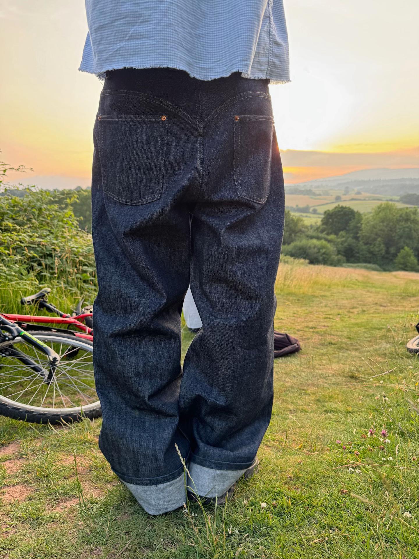 - Durable denim fabric with structured drape