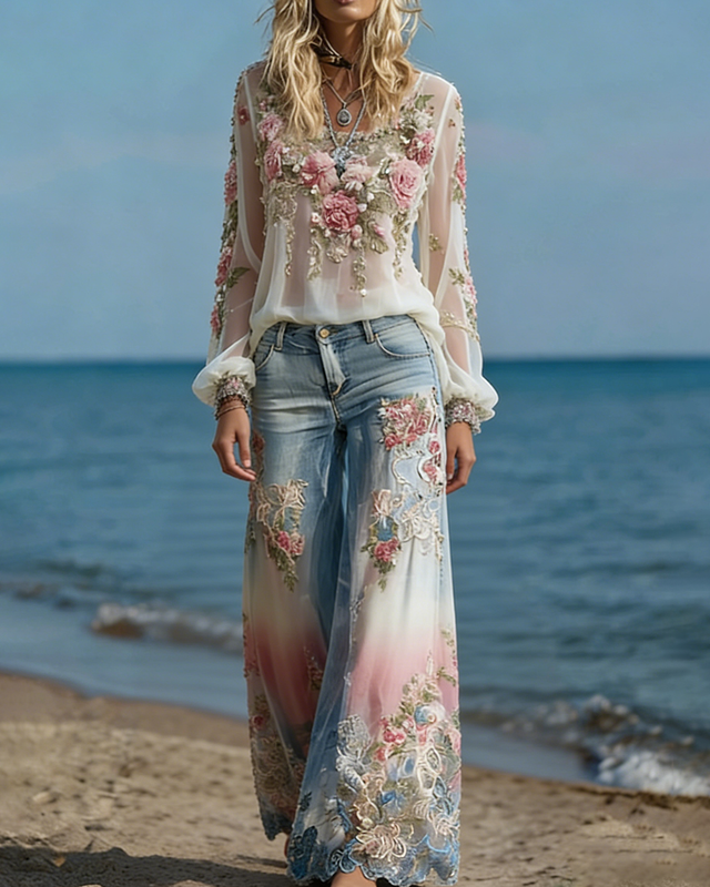 Women's Spring Resort Floral Embroidered Top & Pants Two-Piece Set4752